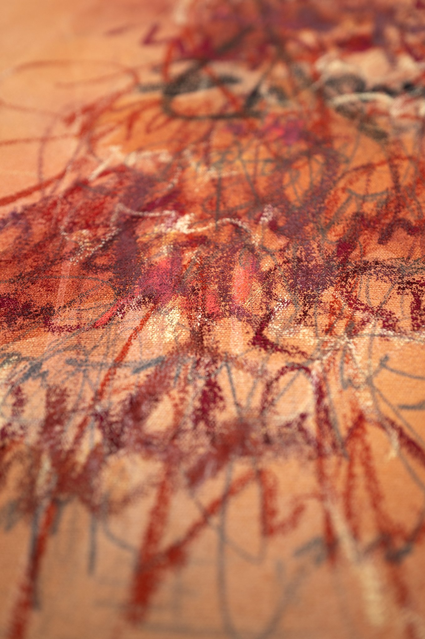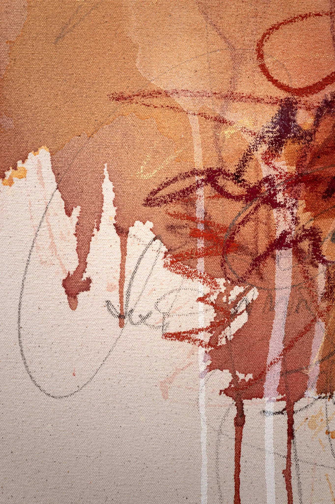 This work captures the friction and conflict of starting a painting, where identity first meets the canvas in a space of experimental warmth.
