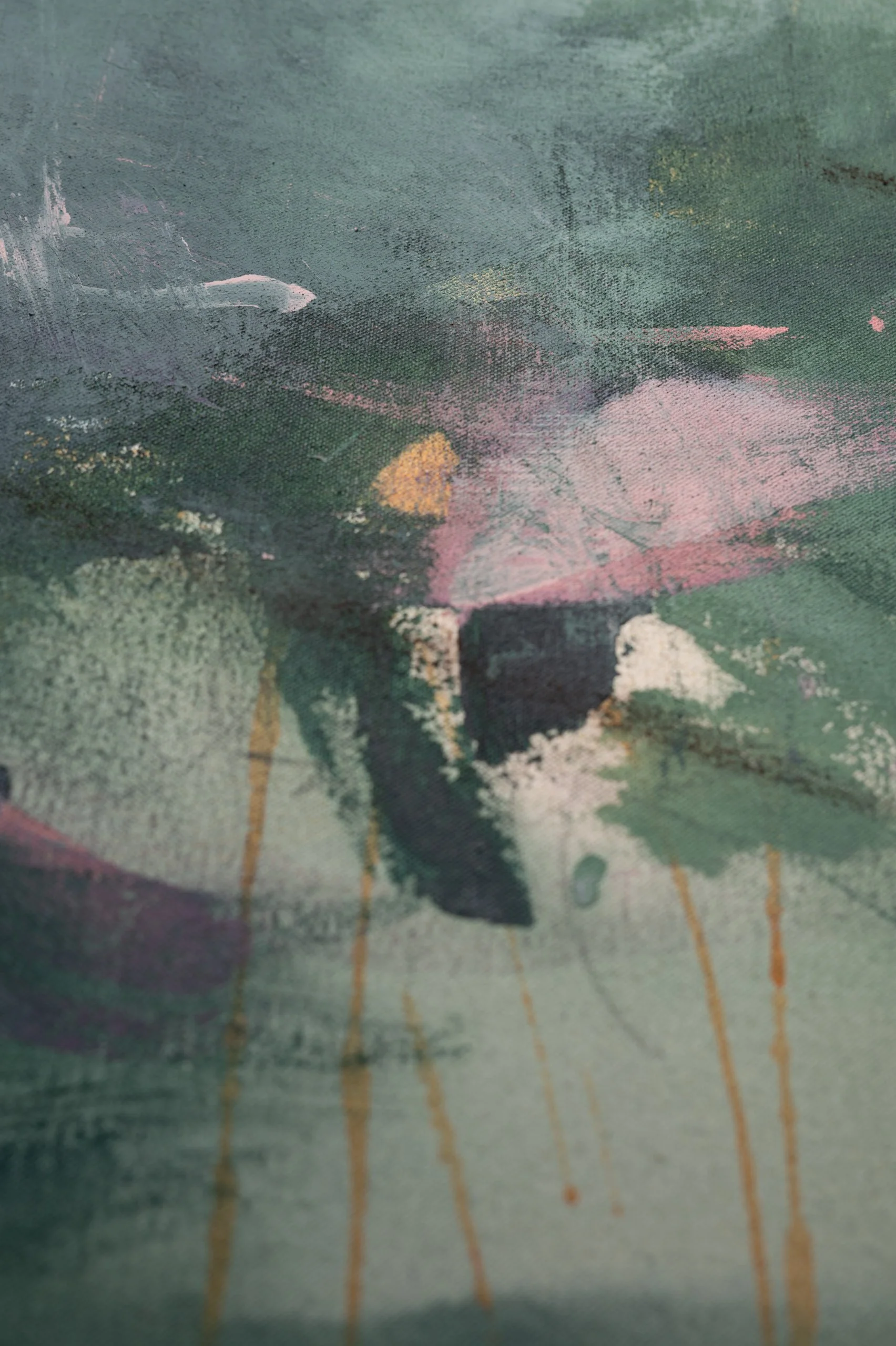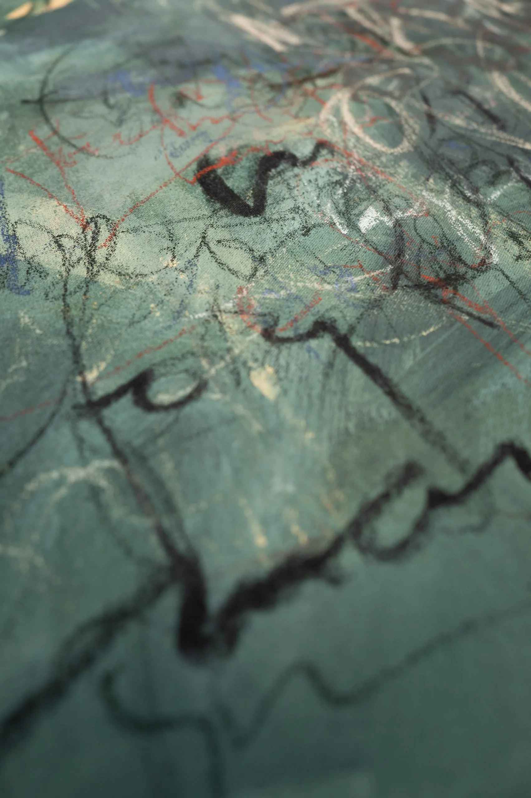 This piece is about the layering of strokes and the way different materials interact. The storytelling happens as marks from layers underneath shine through – old writing that was erased but still leaves a trace of the process.