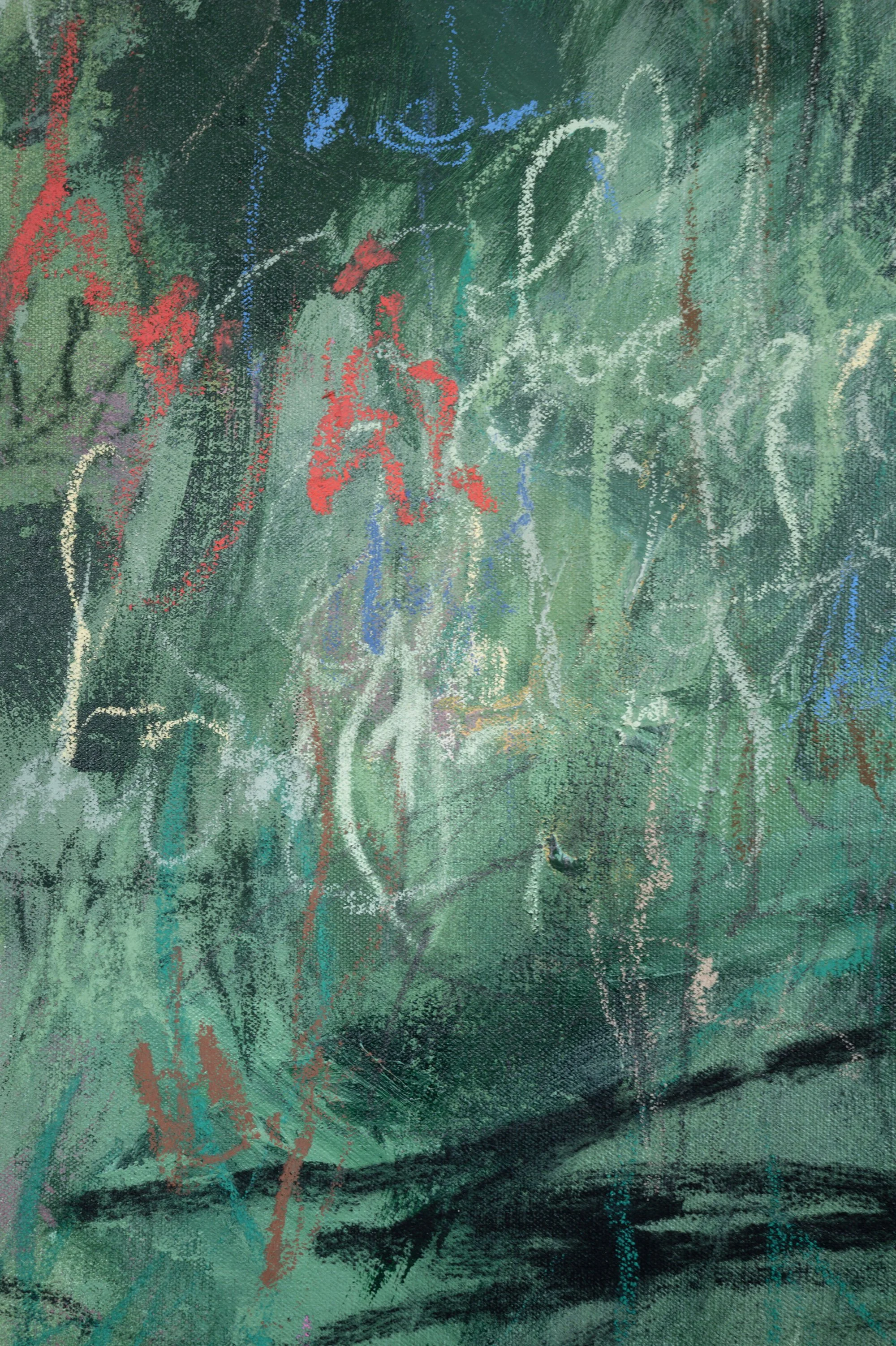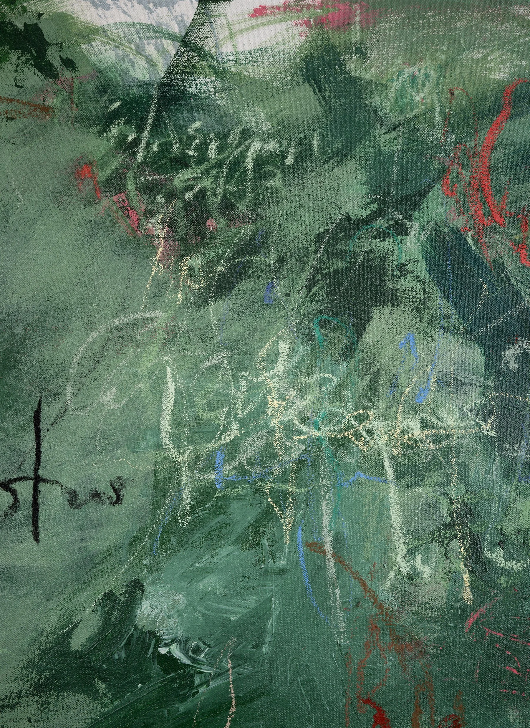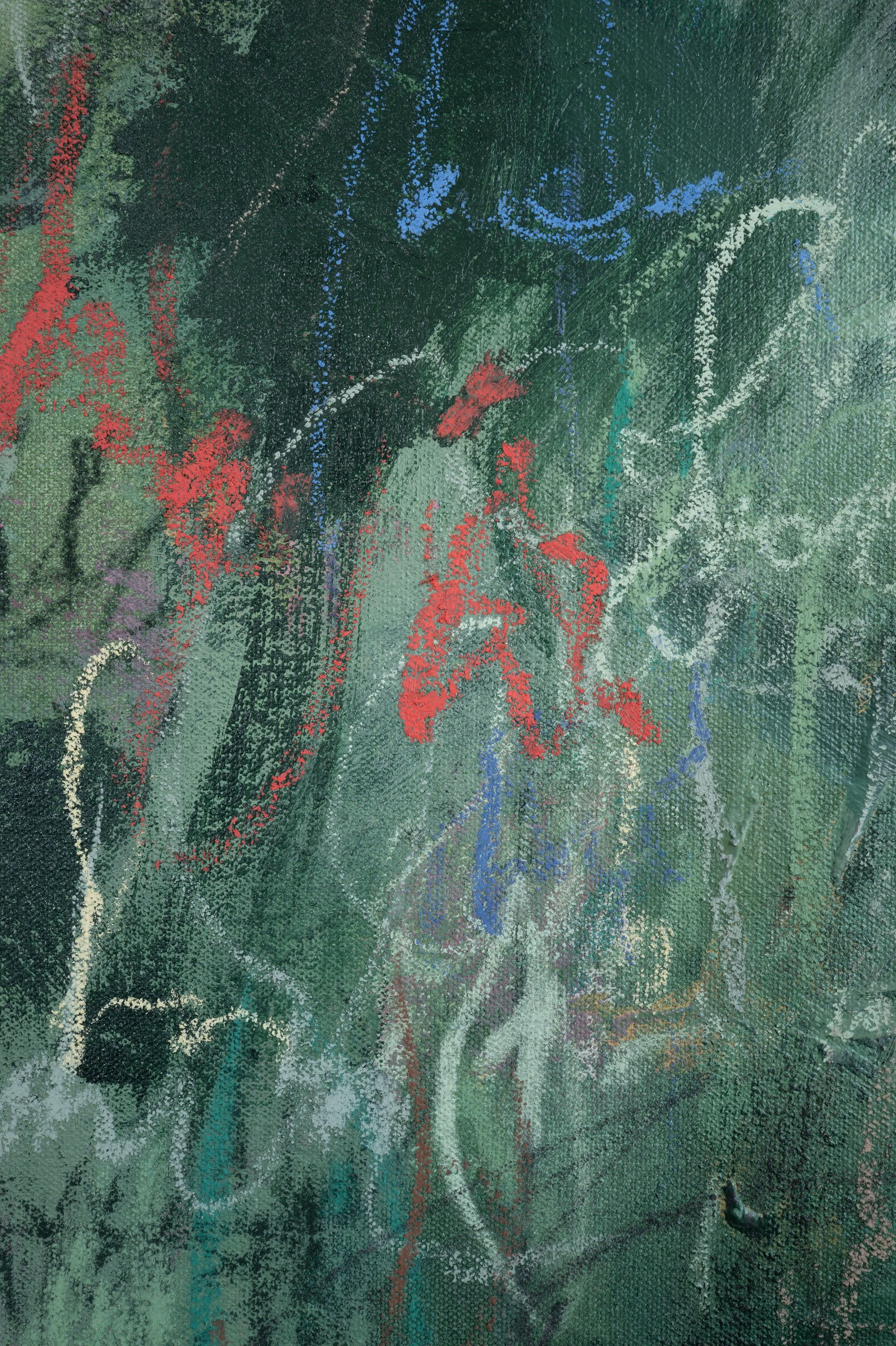 The Architecture of Afterthoughts is shaped by revision and return. The painting began as a surface dominated by vivid pinks and reds, later reworked through dense layers of green acrylic that partially obscure – yet never fully erase – the earlier composition. Traces of the original remain visible at the edges and through interruptions in the paint, functioning as memory rather than focal point.
