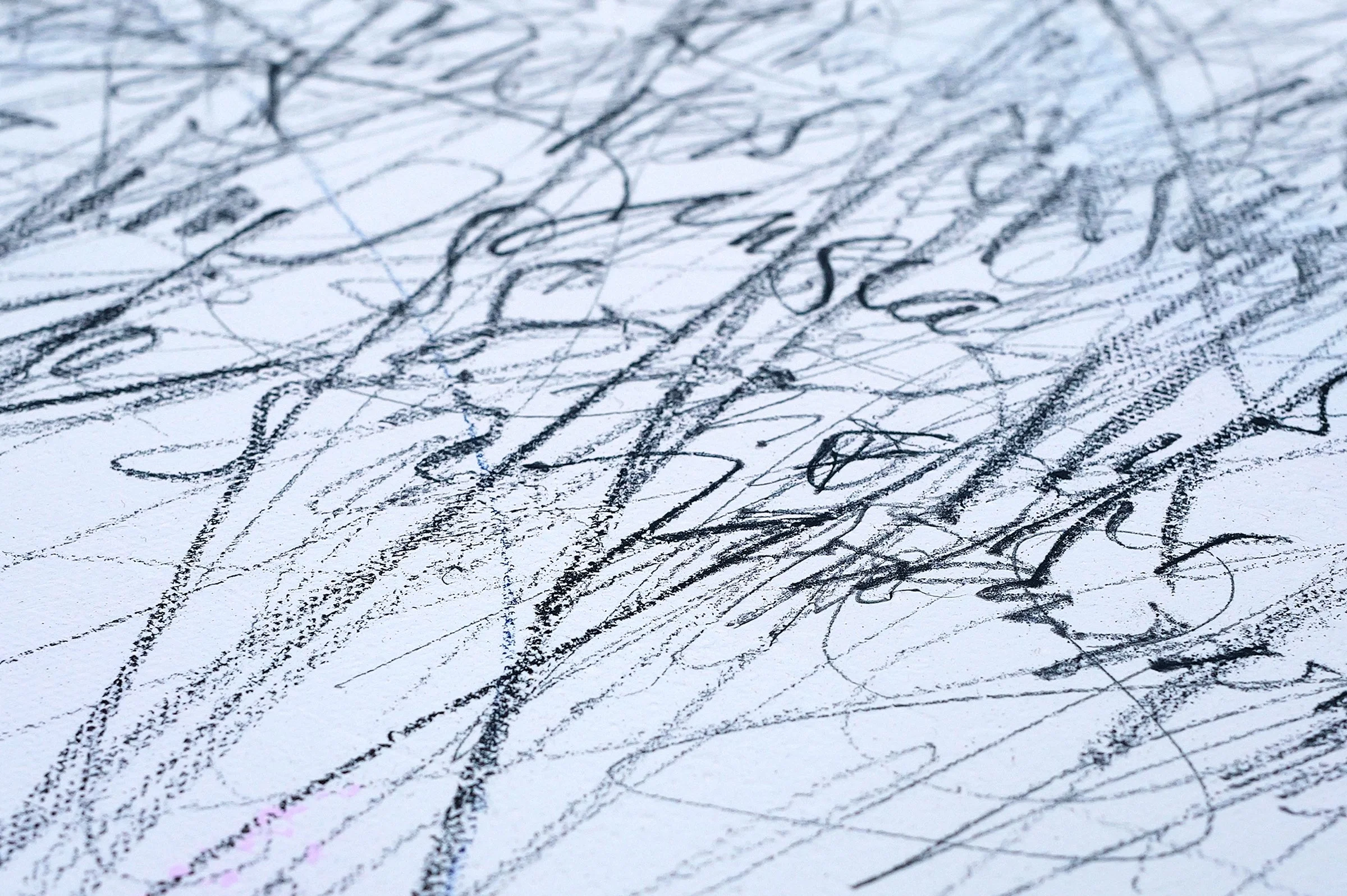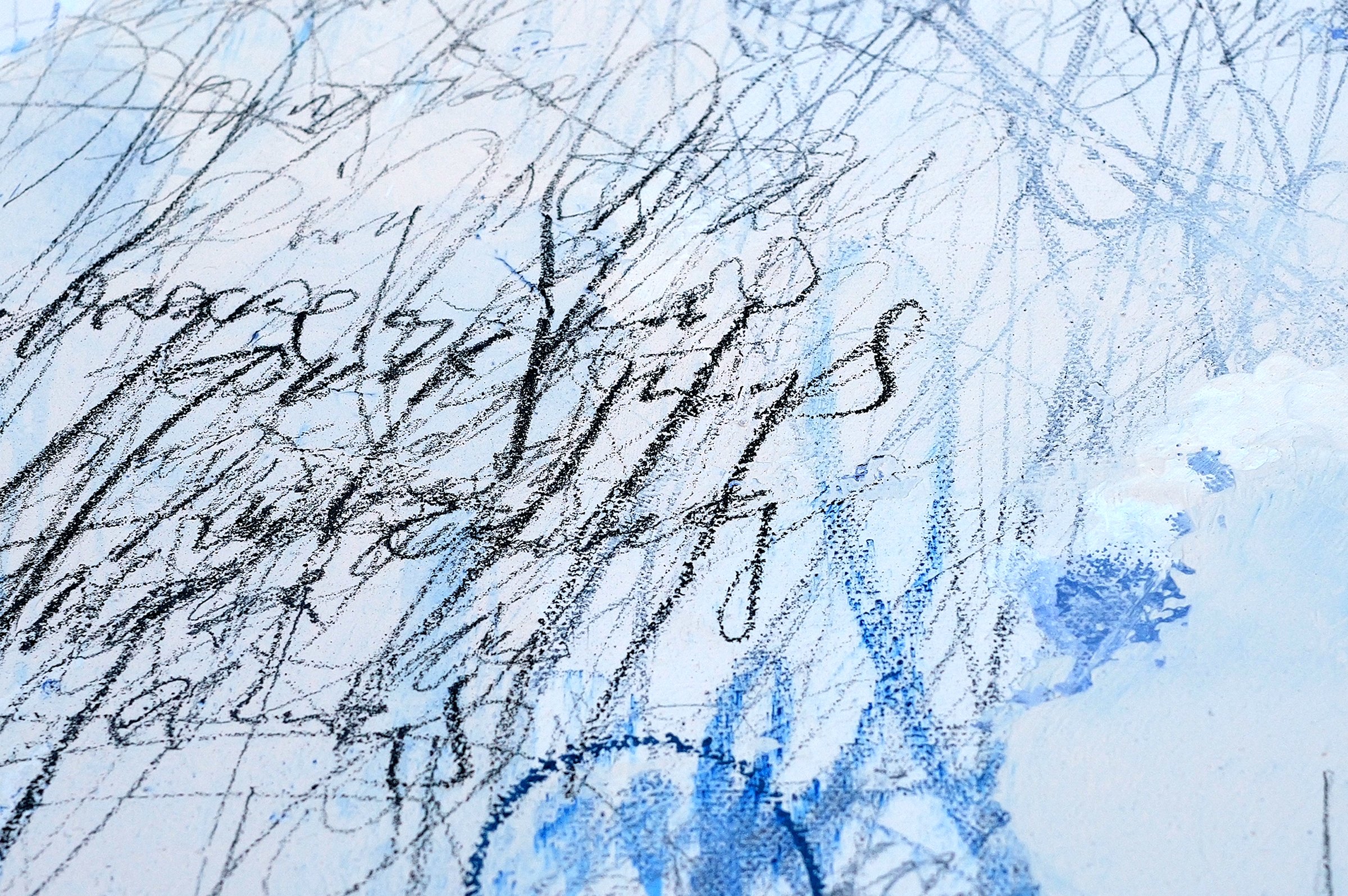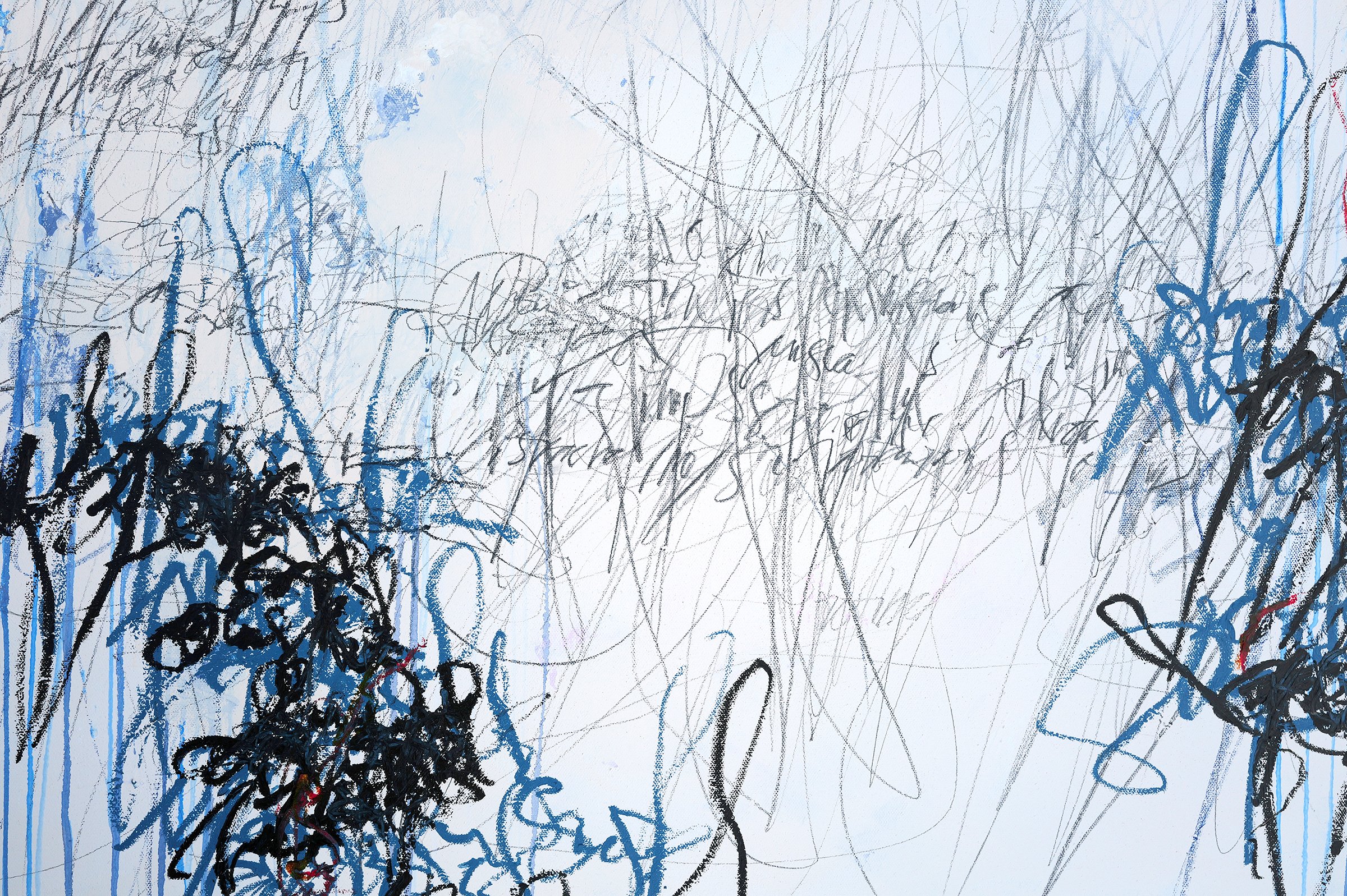 This piece weaves layered writing into a visual rhythm, where graphite and oil stick overlap like voices in quiet conversation. The marks begin softly, almost readable, echoing musical notation – then build into a bold crescendo of visceral mark-making, driven by movement and emotion.