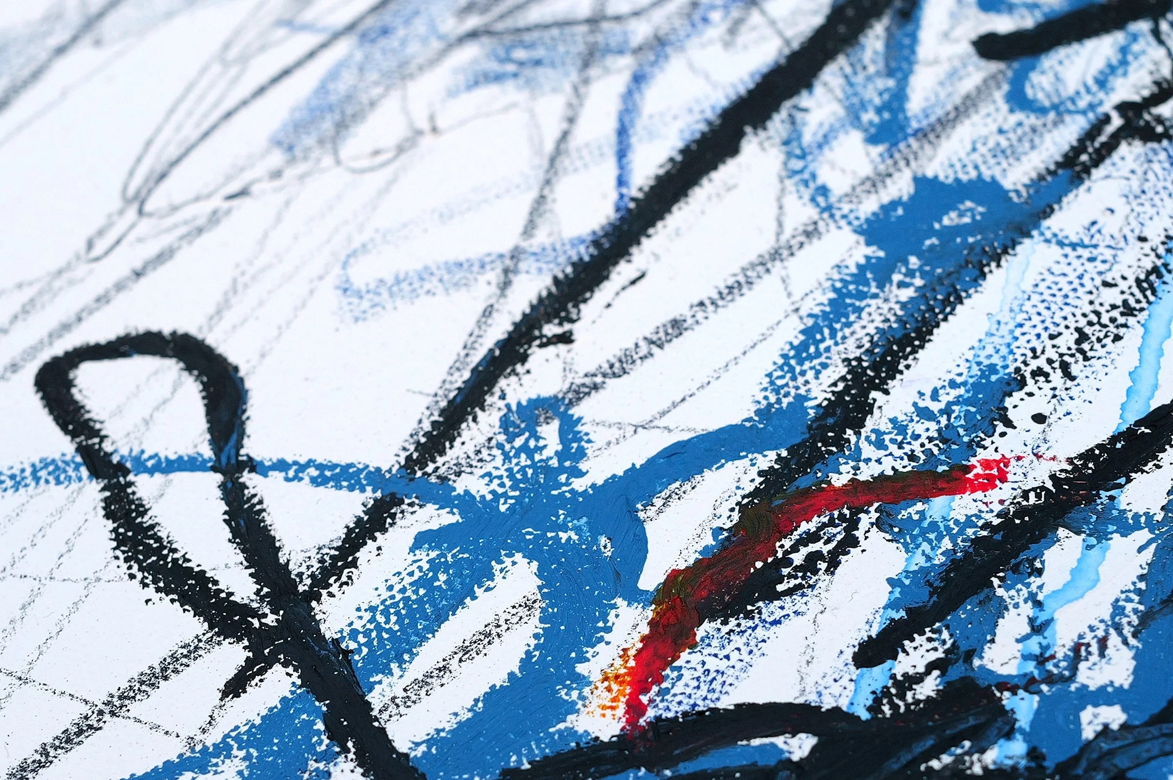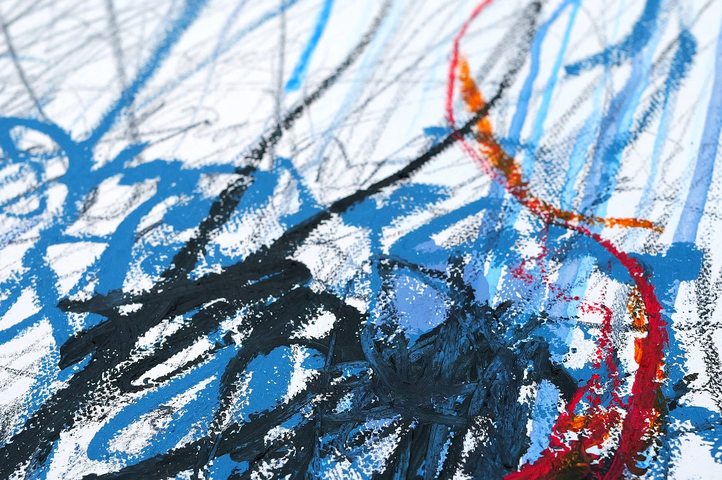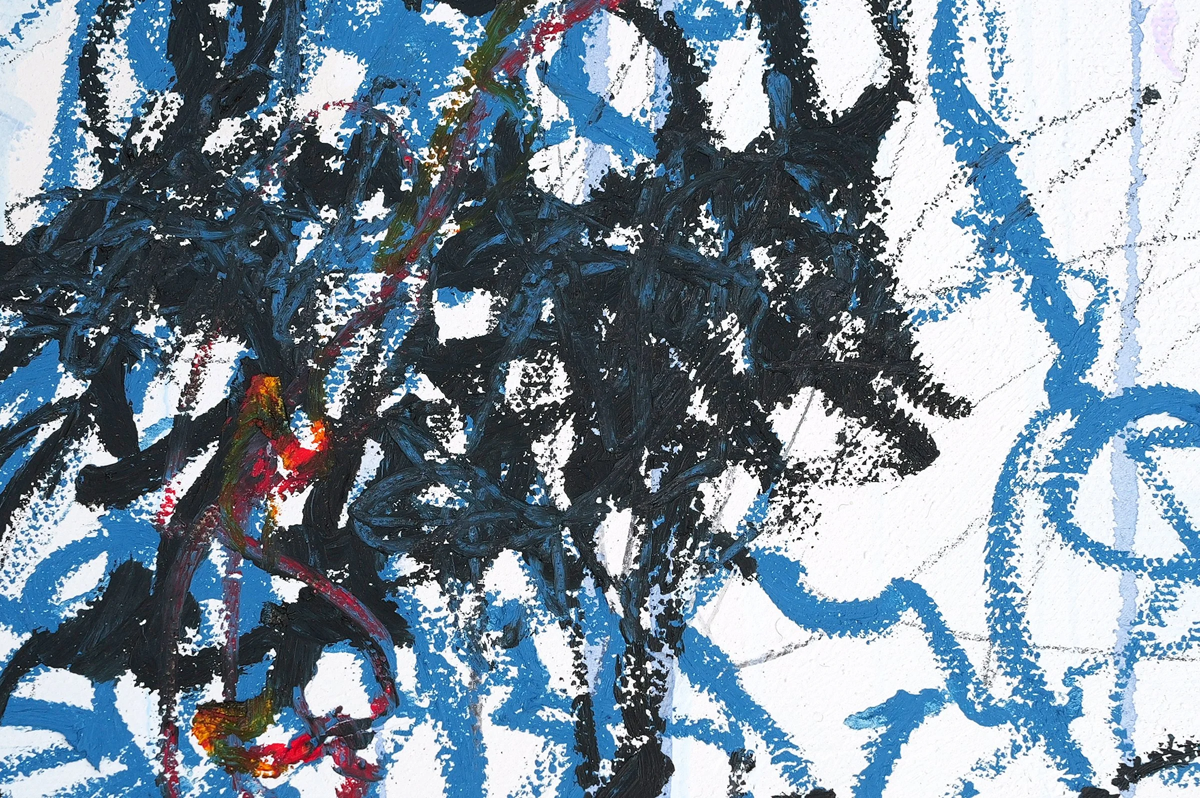 This piece weaves layered writing into a visual rhythm, where graphite and oil stick overlap like voices in quiet conversation. The marks begin softly, almost readable, echoing musical notation – then build into a bold crescendo of visceral mark-making, driven by movement and emotion.